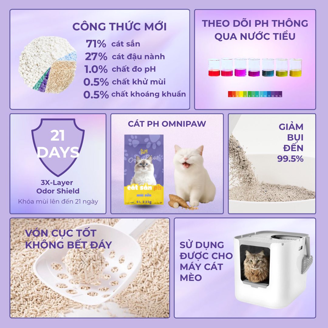 Cát sắn chỉ thị pH OmniPaw là dòng cát mèo thông minh thế hệ mới, cho phép theo dõi sức khỏe đường tiểu của mèo ngay tại nhà thông qua sự thay đổi màu sắc.